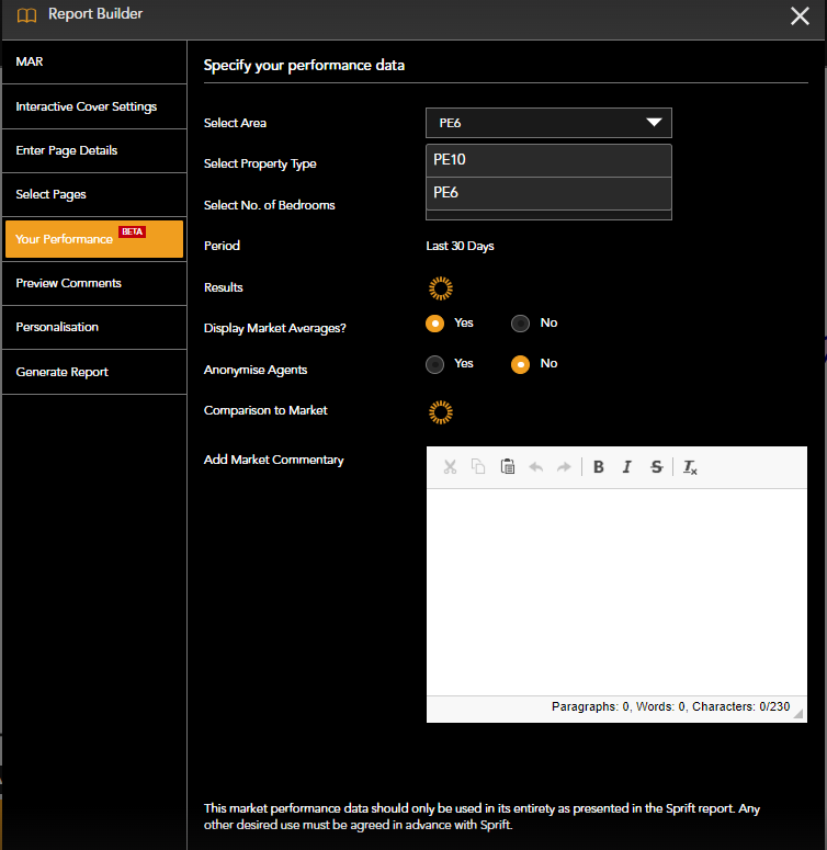 The 'Your performance' page will show the postcode area of the property your are creating a report on as well as the postcode areas allocated to your account