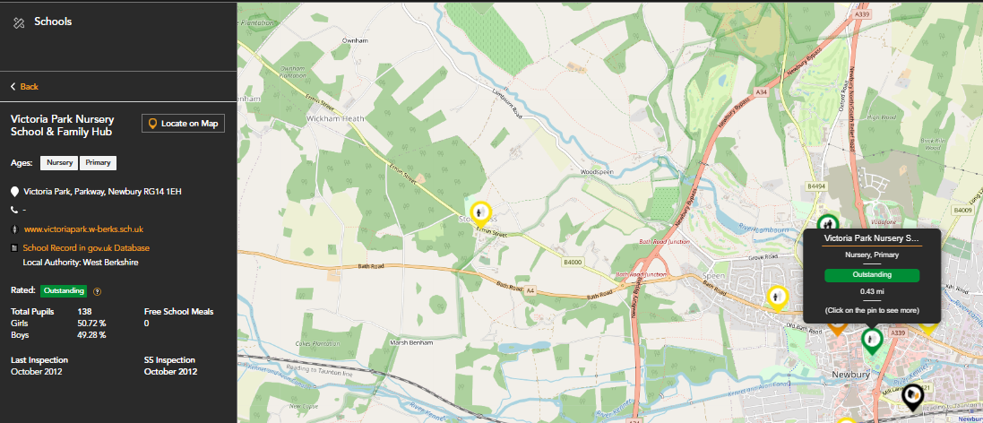Selecting a school from the left hand list will pin point it on the map and open the Key Details pop up.
