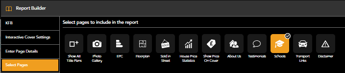 The school map can be included in the interactive Key Facts for buyers report by highlighting the 'Schools' icon on the select pages tab within report builder.