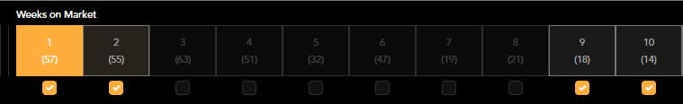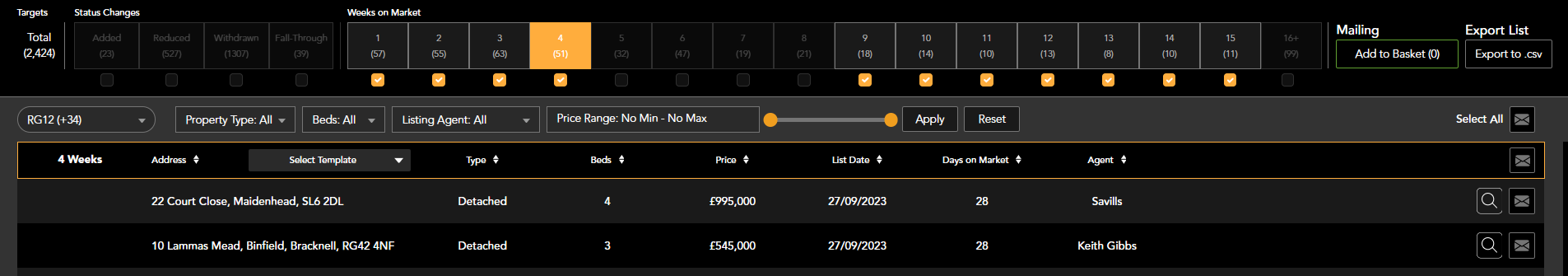 To view addresses within a target simply select the relevant tick box beneath the weeks on market filters.